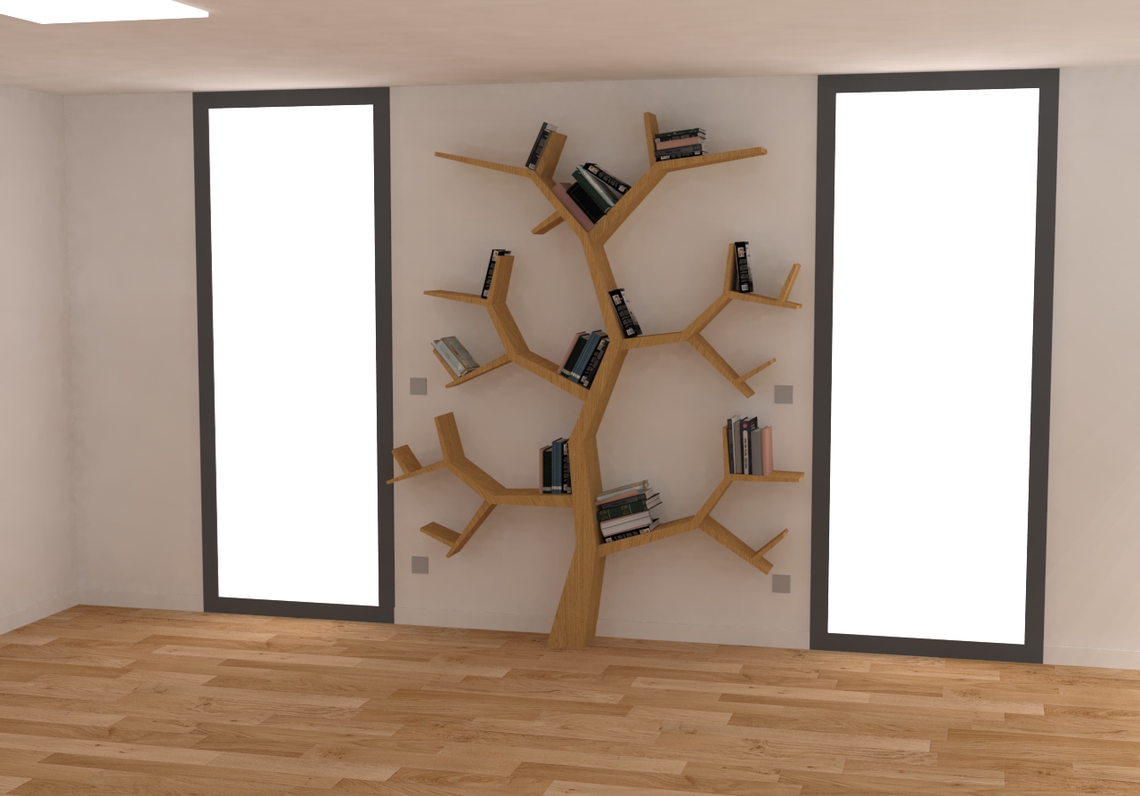 La bibliothèque arbre invite la nature dans votre salon. Conçue sur-mesure, elle permet de ranger en beauté la collection de romans de son propriétaire. Elle décor arborescament le salon. En outre, j’ai réalisé l’ensemble des branches en coupe en sifflet apportant du caractère à la forme des arbres.