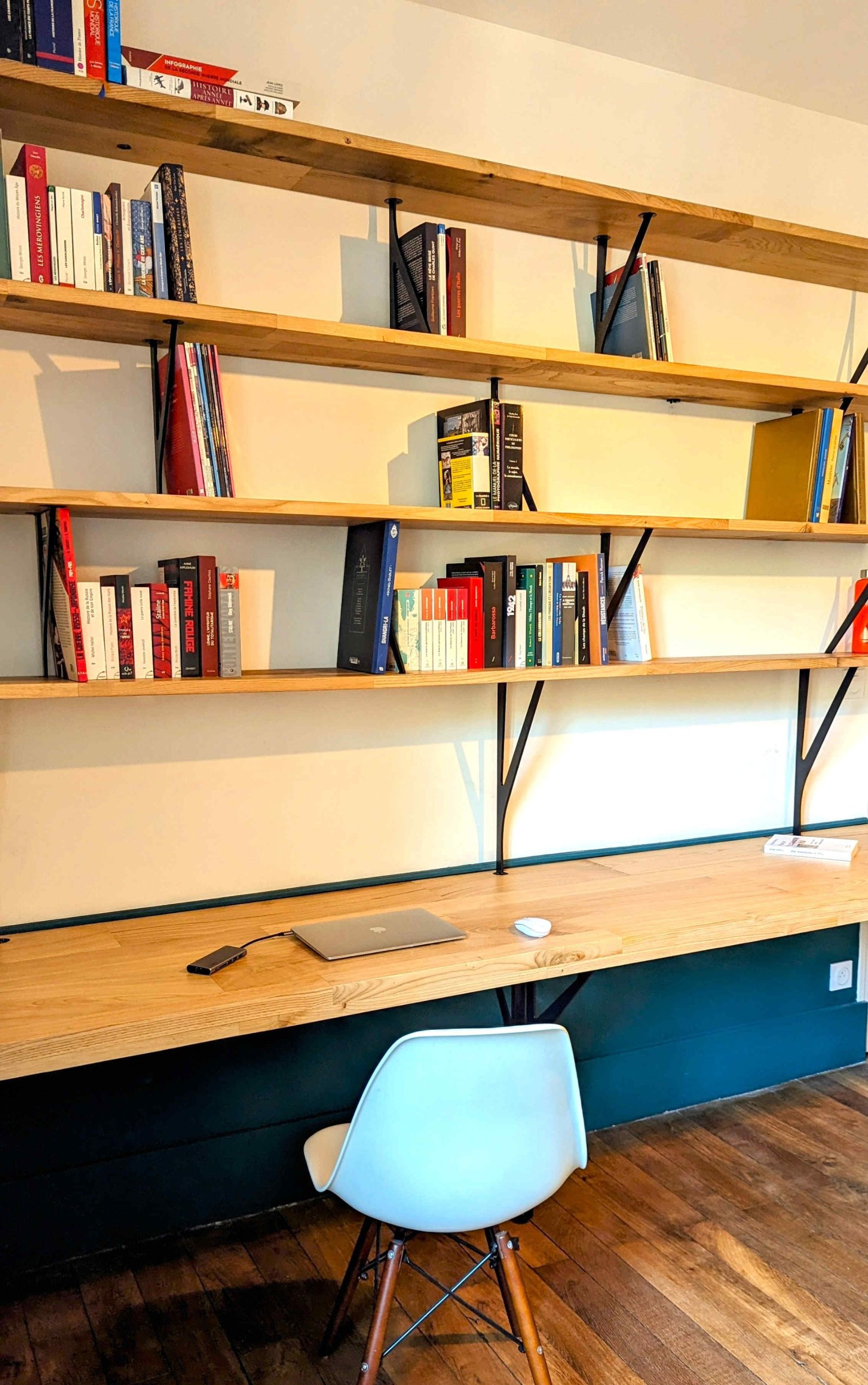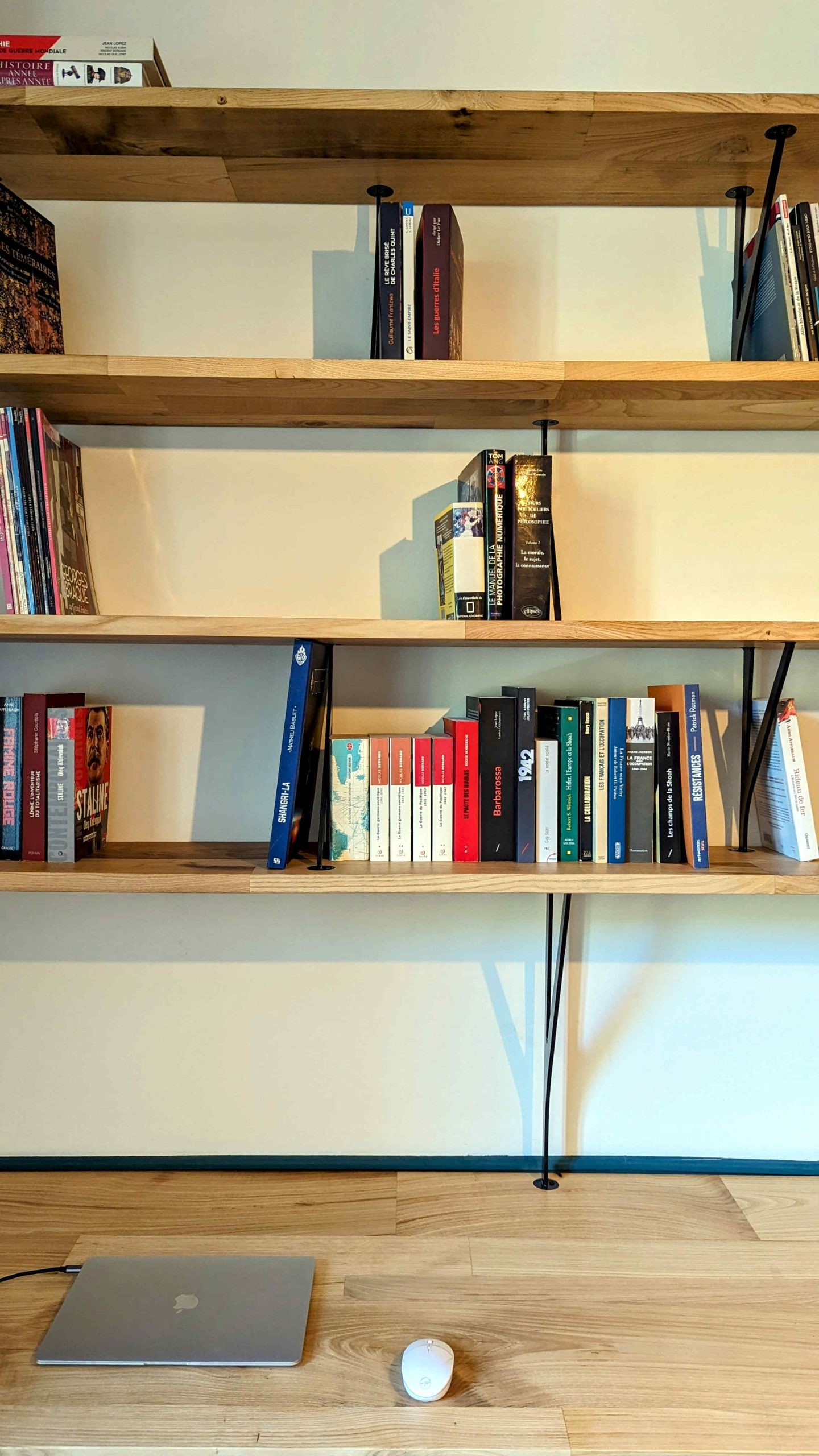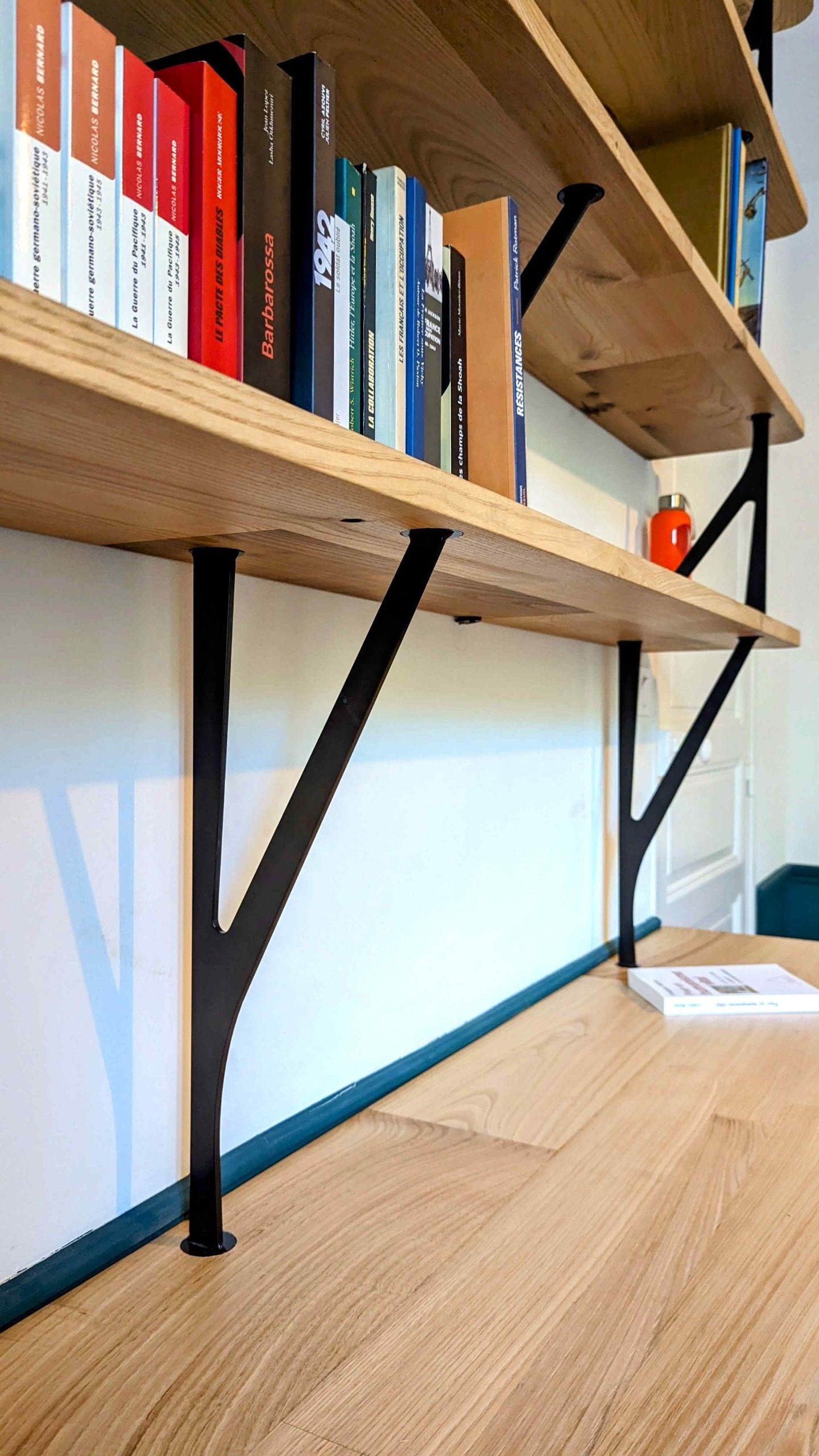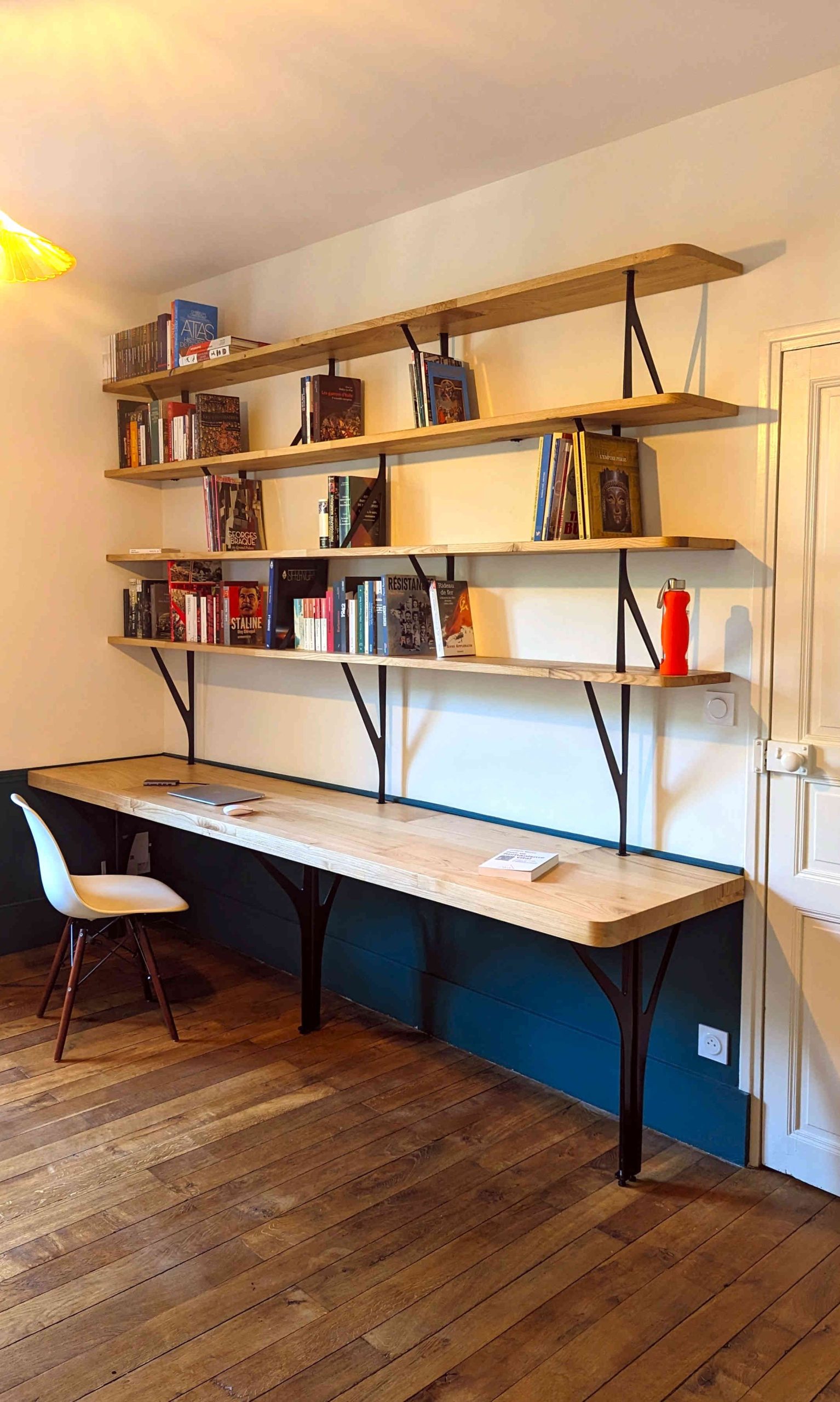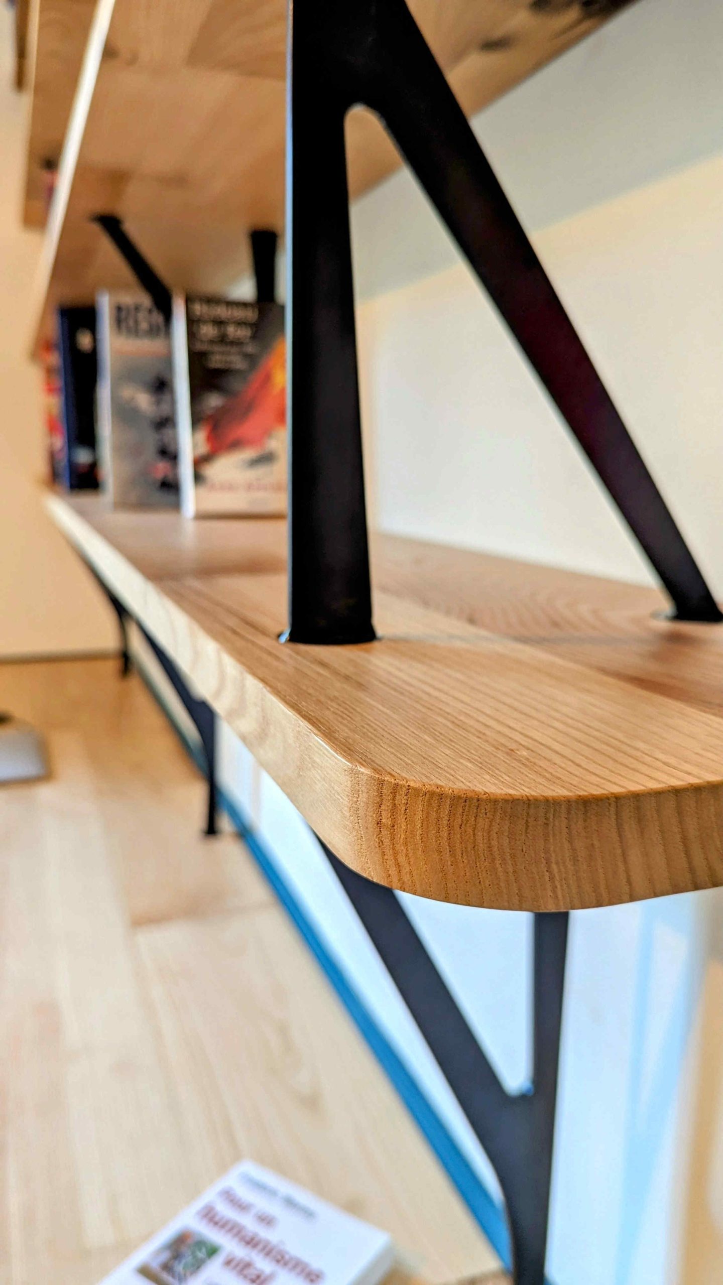 Nos bibliothèques en bois et métal , sobres et épurées habilleront joliment votre salon. Nous optons pour des styles épurés ou plus osés, industriels ou plus classiques grâce aux montants tubulaires métalliques ou de formes courbée. Nous vous proposons toutes formes de profils métalliques, à votre guise. En outre, afin de faciliter l’entretien du bois, nous le protégeons à l’aide d’un vernis ou d’une huile appliqué en 3 couches. Nous réalisons les tablettes en bois massif. En chêne, châtaignier, érable ou autre essence, à votre convenance. Nous pouvons concevoir les supports métalliques plus discret si nécessaire. Un thermolaquage est appliqué sur les parties métalliques. Vous choisissez la couleur qui convient le mieux. Les montants pourront ainsi être peints à la couleur de votre choix. Aussi, cette bibliothèque pourra être adaptée selon vos dimensions. N’hésitez pas à nous contacter.