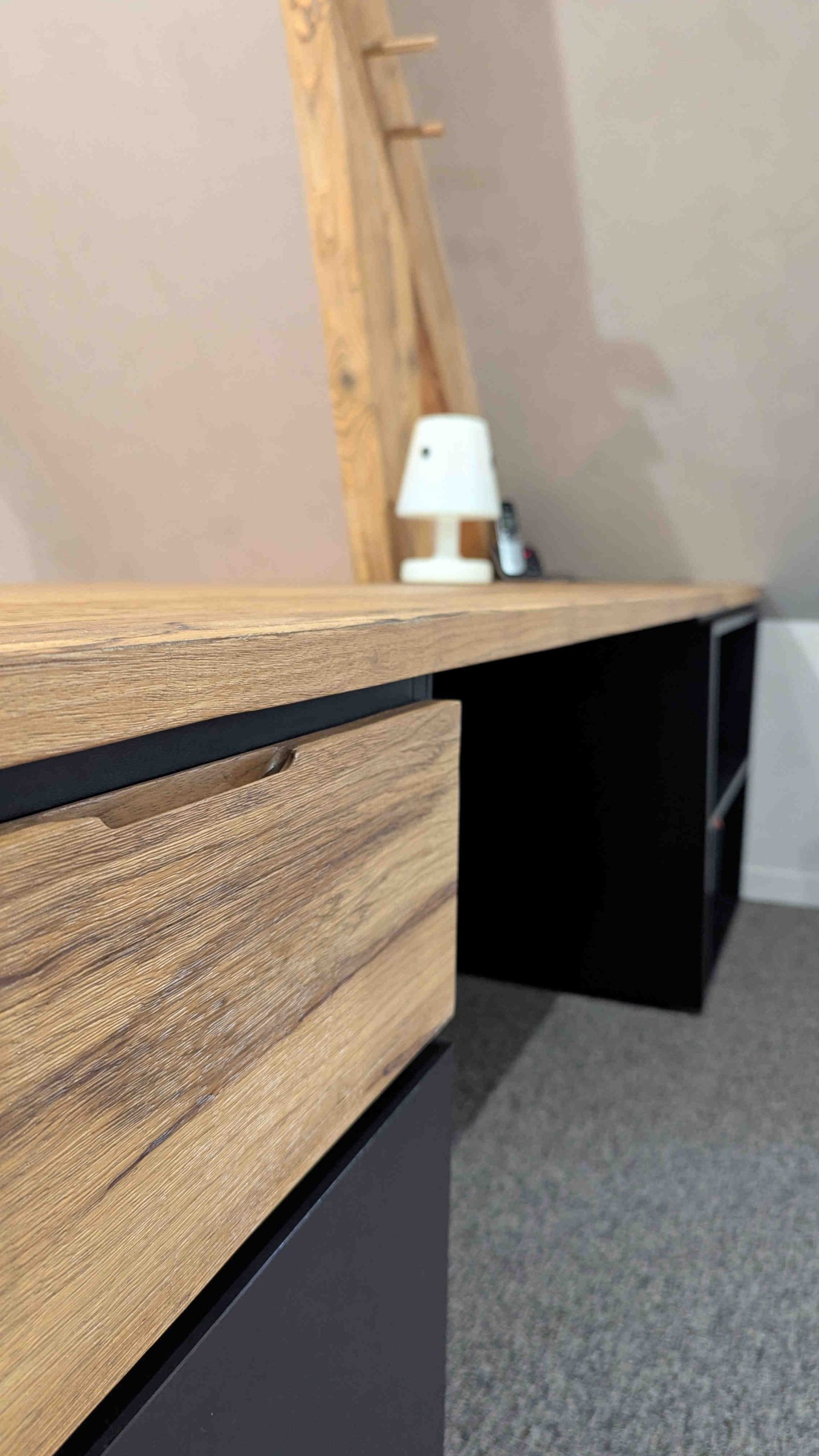 Un joint creux sous le plateau permet d’apporter de la finesse à l’ensemble. Et l’arrière du bureau aménagé sous forme de caissons lui confère aussi une utilité : rangement et éléments de décoration.