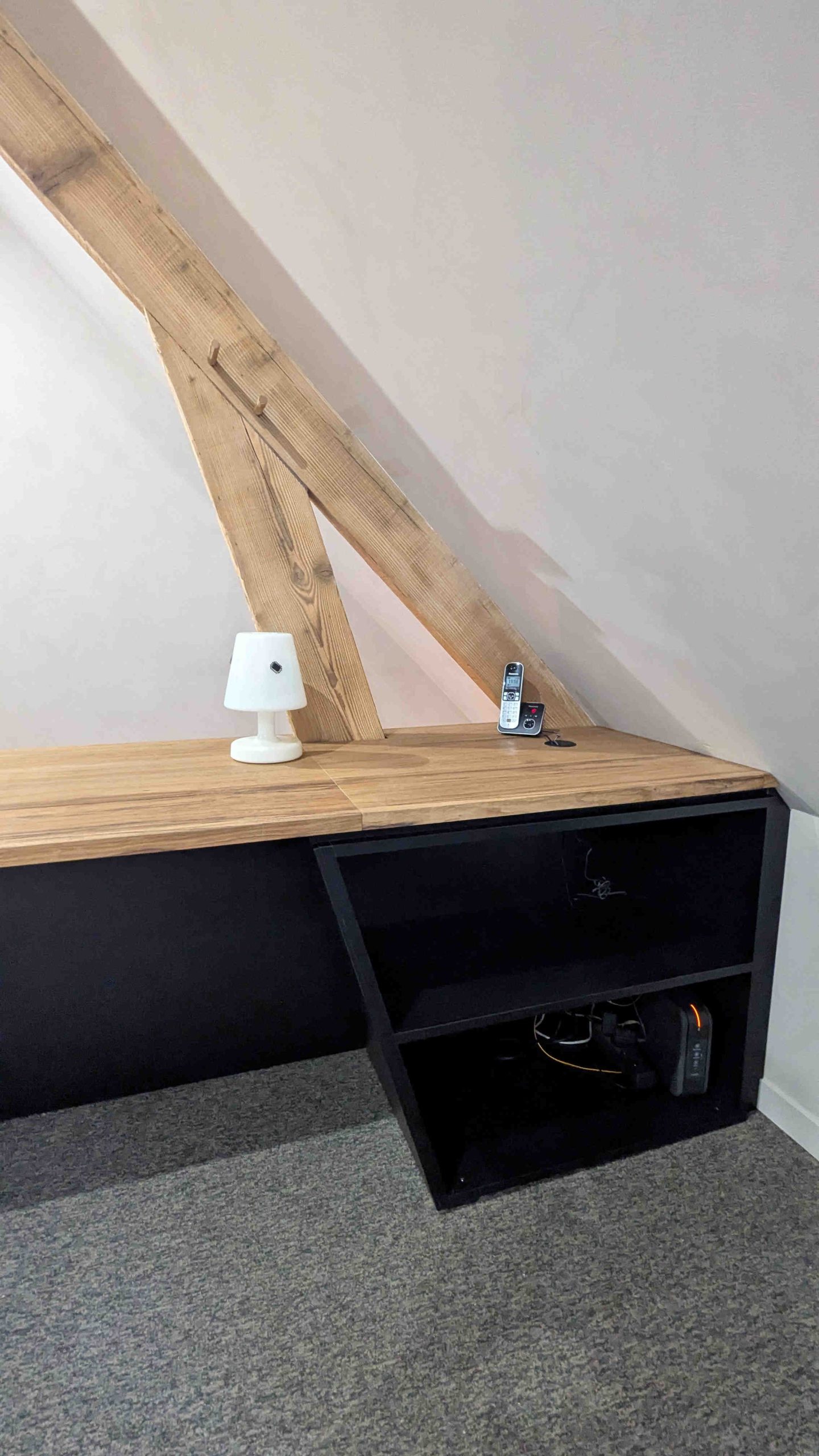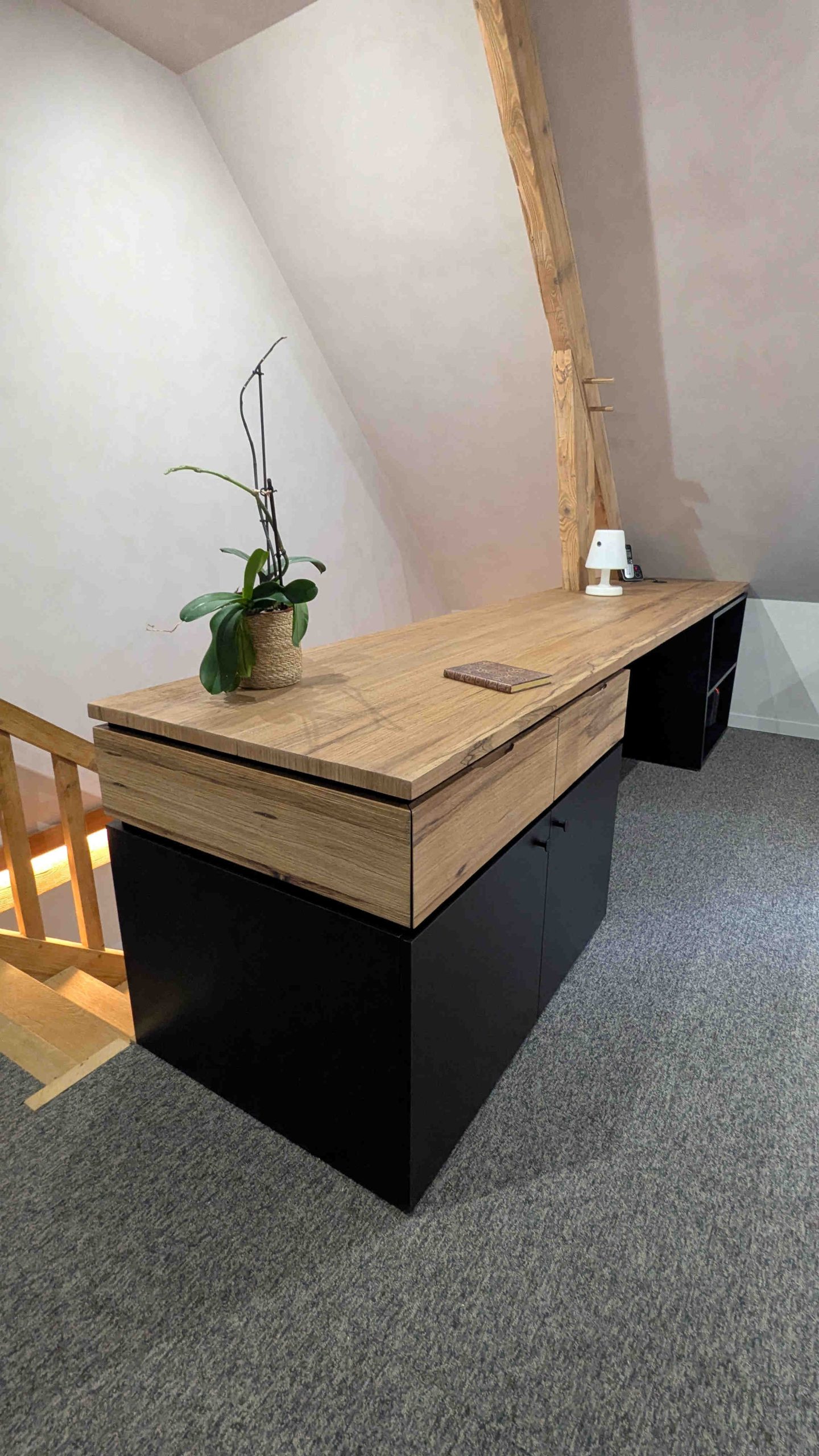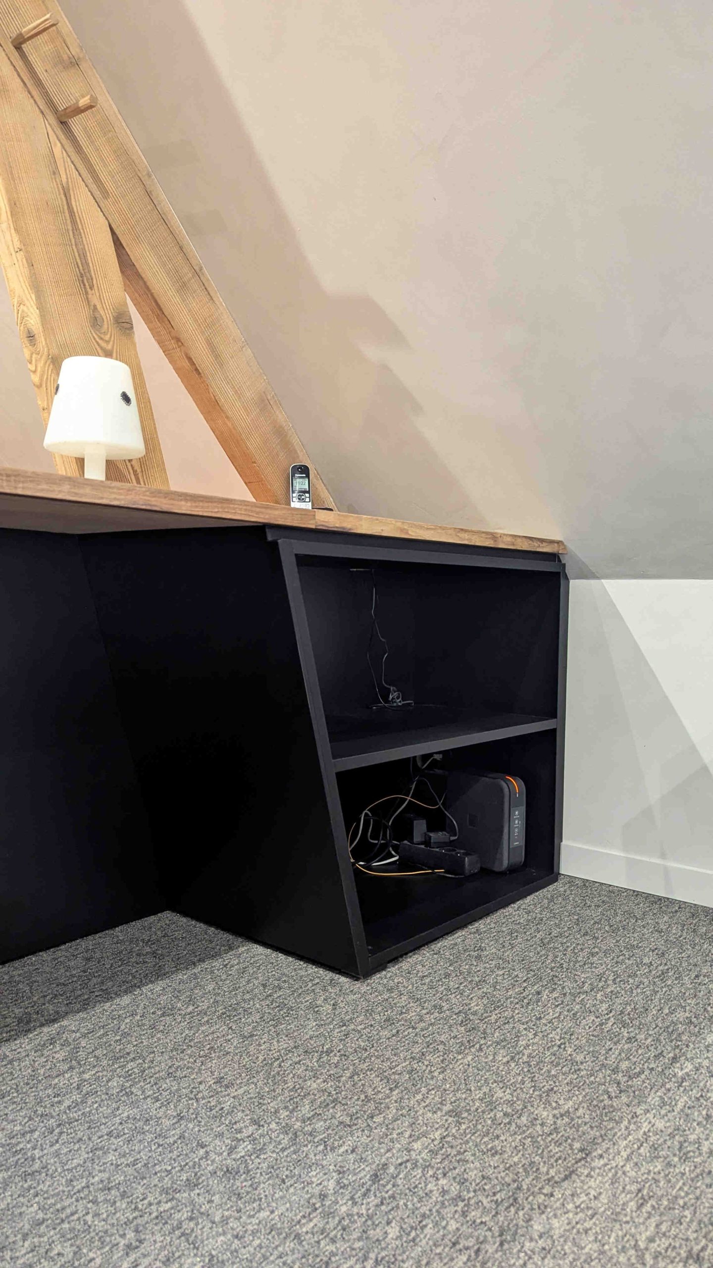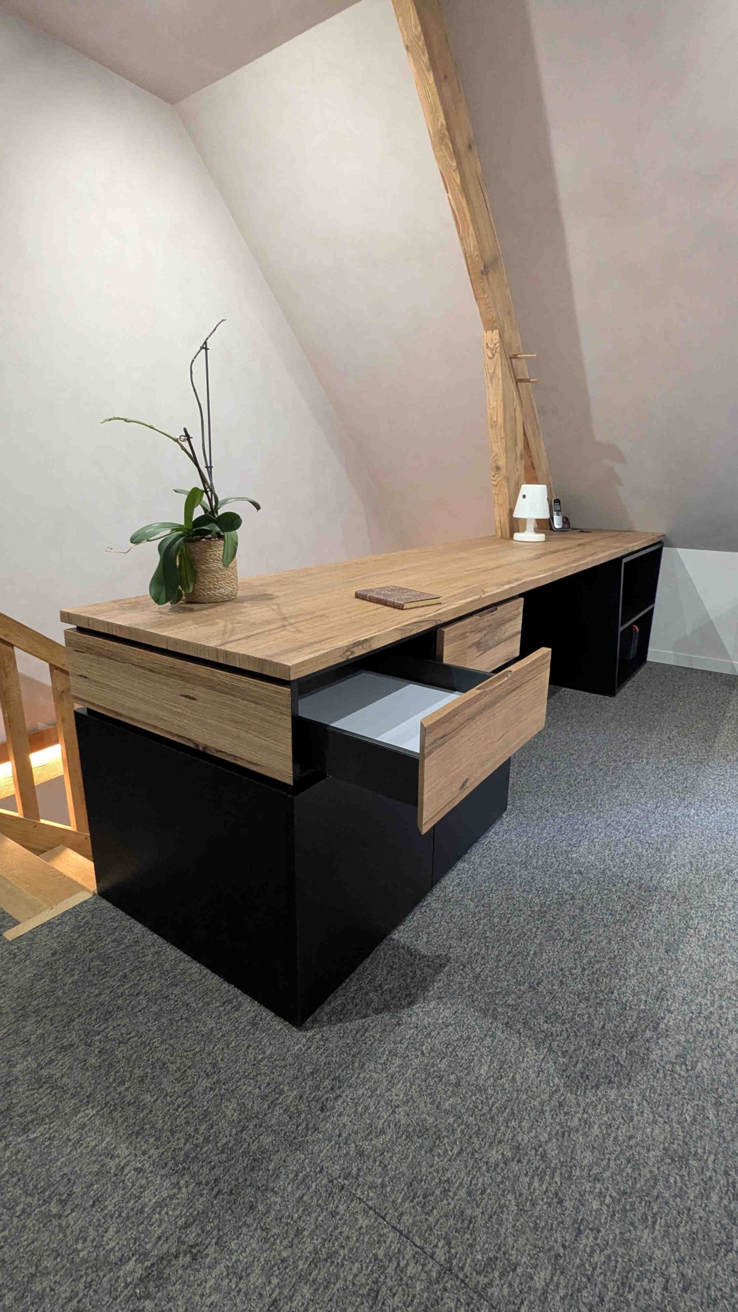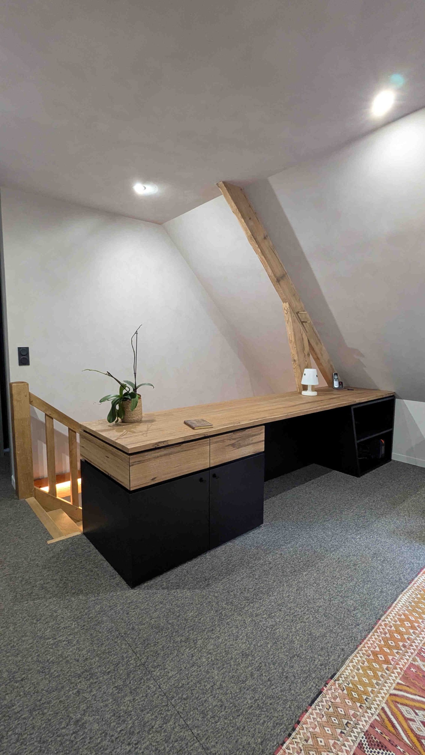 Un bureau sur-mesure conçu spécialement pour se greffer à son environnement. En effet, nous pouvons imaginer comme une continuité des éléments de charpentes et du rampant de toiture. Aussi, nous l’avons réalisé entièrement en réemployant un ancien aménagement de bar, de Rodez. En effet, le plateau ainsi que la structure noire sont issus d’anciennes cloisons de séparation de ce bar. Nous retrouvons ces éléments noirs plutôt en partie inférieure, à l’avant et à l’arrière du bureau. Le plateau quant à lui, en bois exotique, nous l’avons brossé et protégé à l’aide d’une huile portant la mention Écolabel Européen.