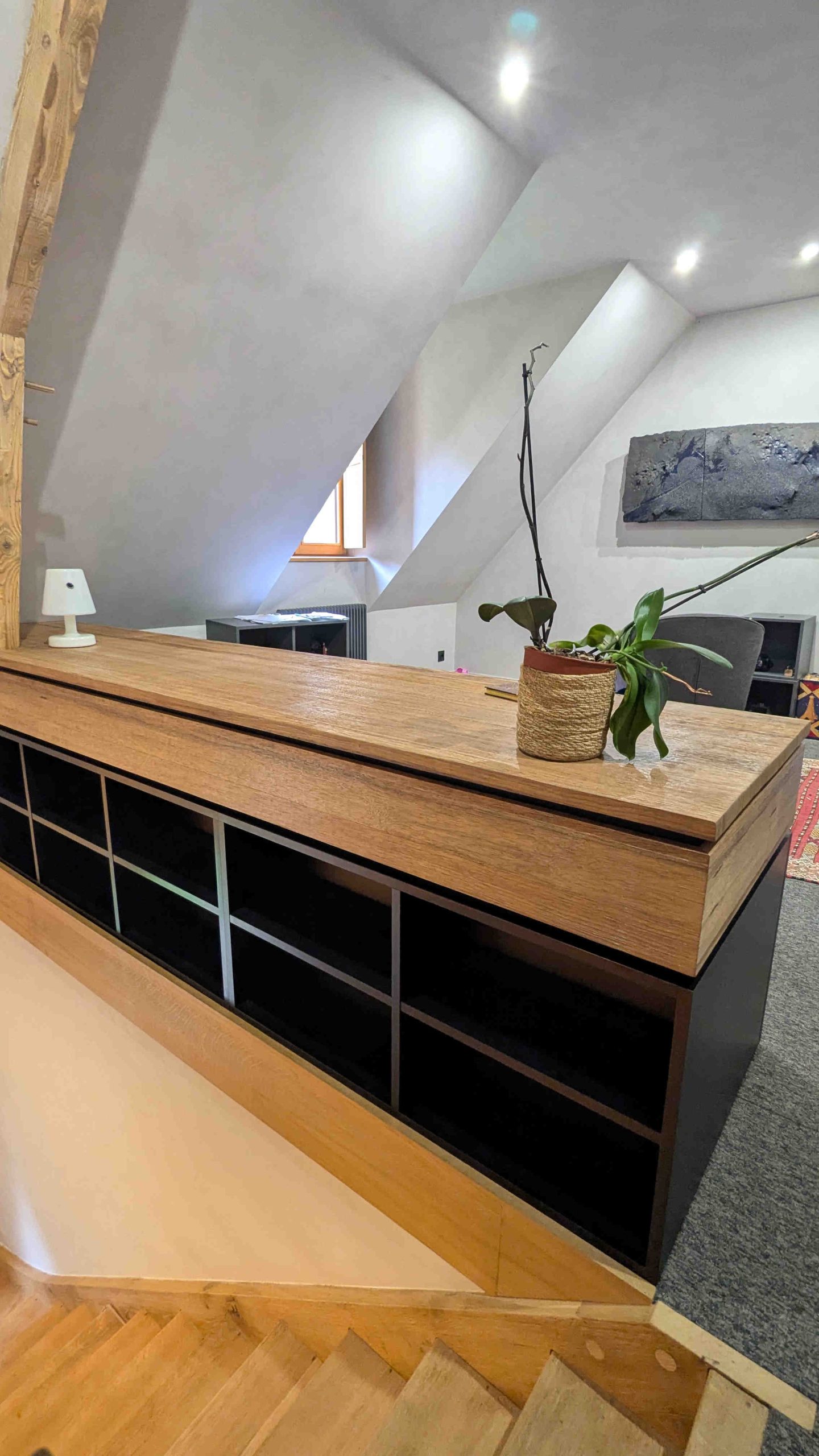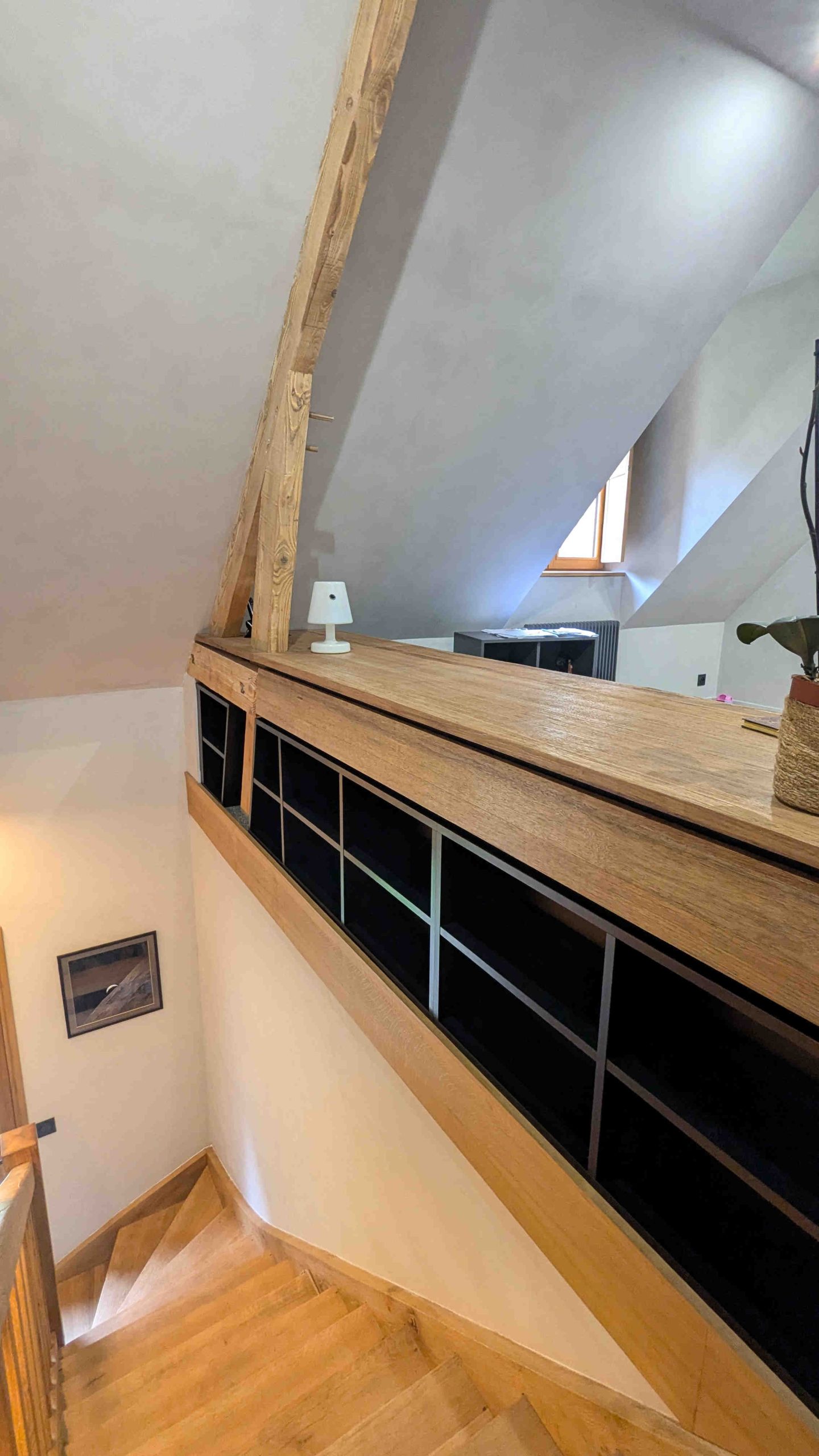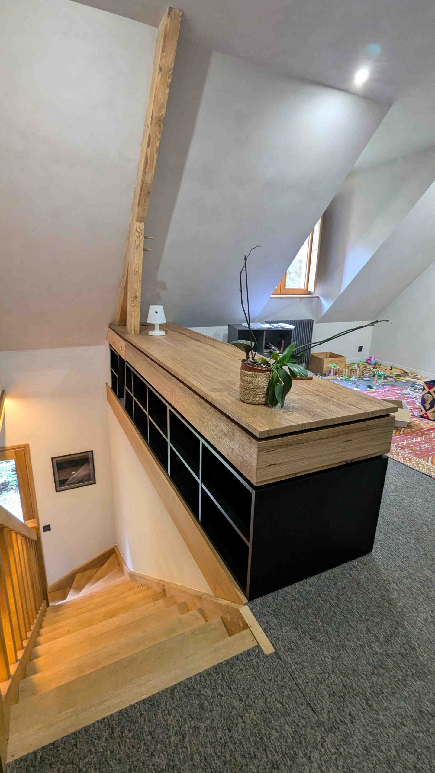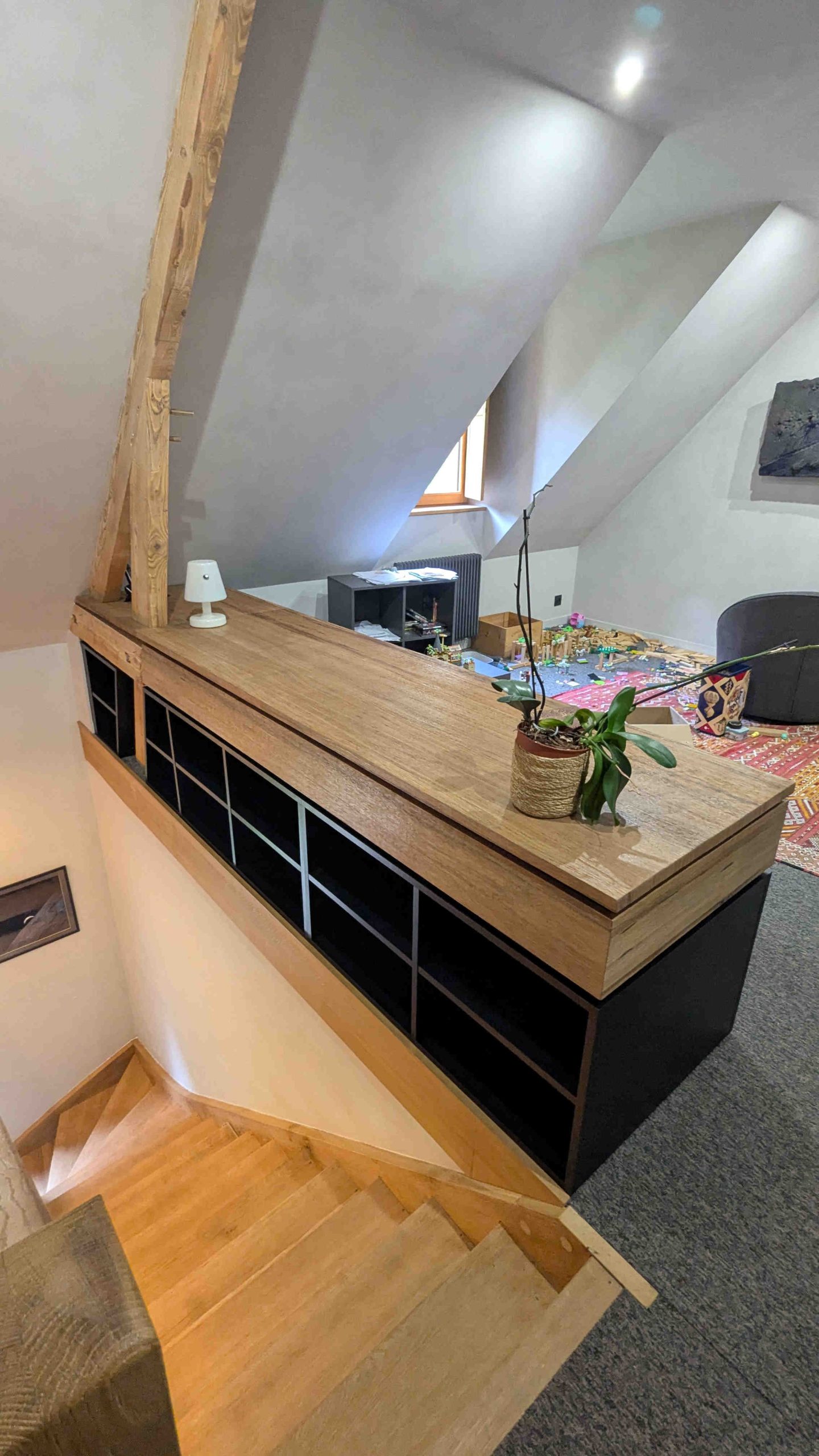 Un bureau sur-mesure conçu spécialement pour se greffer à son environnement. En effet, nous pouvons imaginer comme une continuité des éléments de charpentes et du rampant de toiture. Aussi, nous l’avons réalisé entièrement en réemployant un ancien aménagement de bar, de Rodez. En effet, le plateau ainsi que la structure noire sont issus d’anciennes cloisons de séparation de ce bar. Nous retrouvons ces éléments noirs plutôt en partie inférieure, à l’avant et à l’arrière du bureau. Le plateau quant à lui, en bois exotique, nous l’avons brossé et protégé à l’aide d’une huile portant la mention Écolabel Européen.