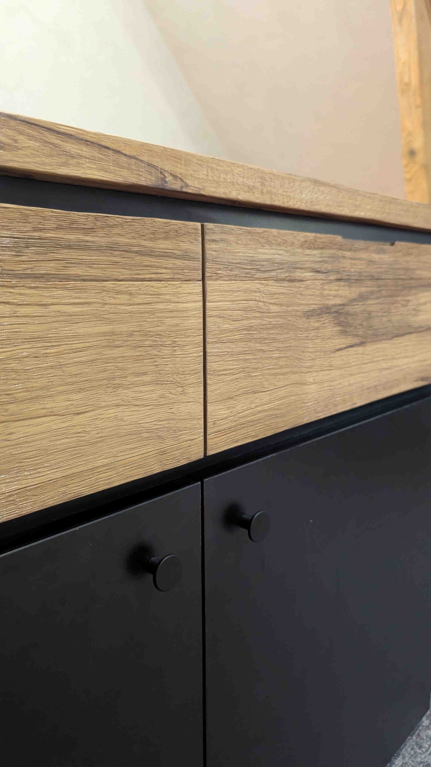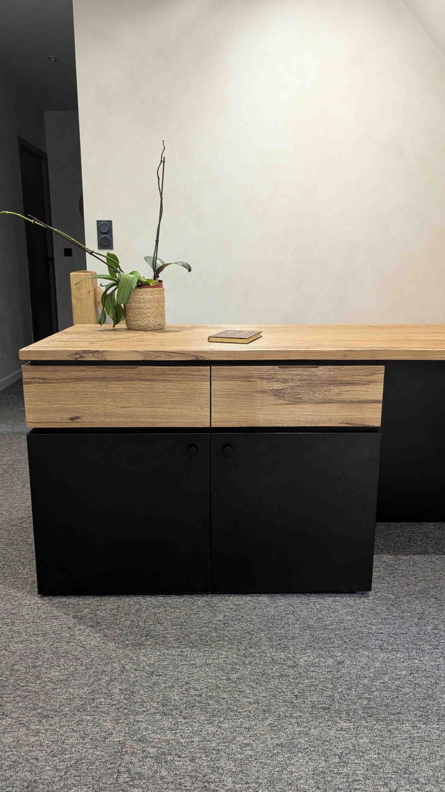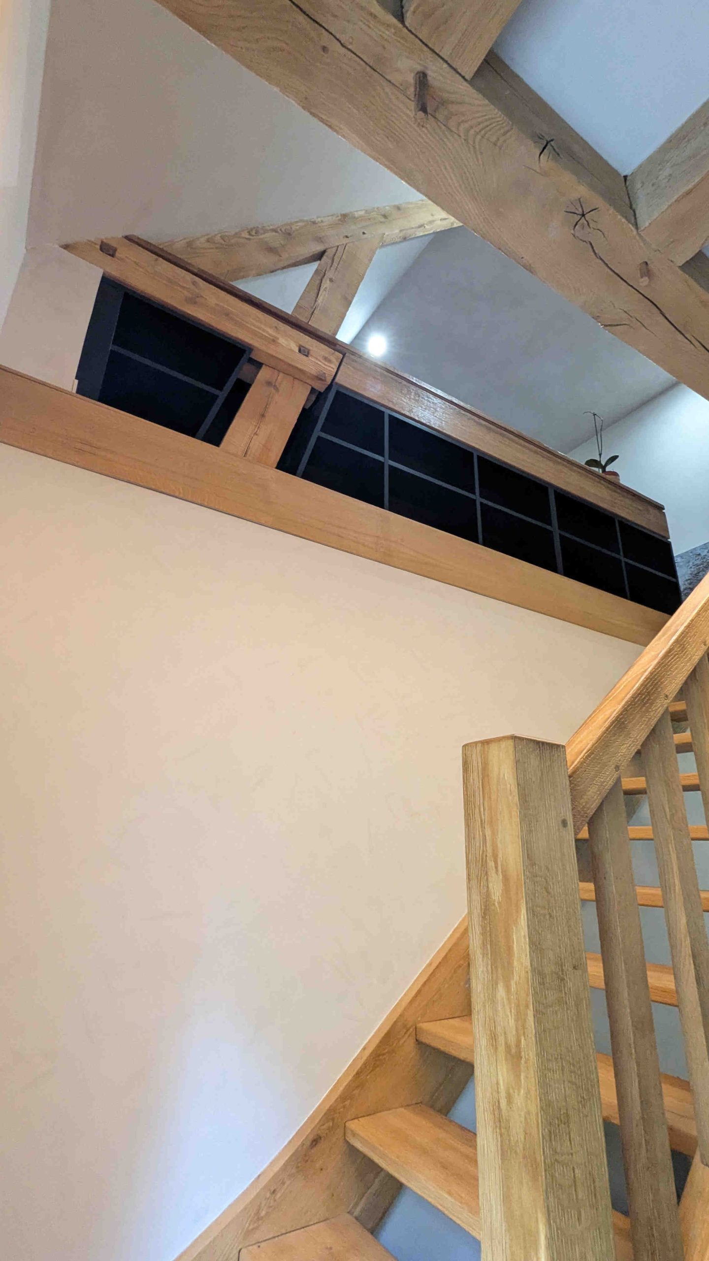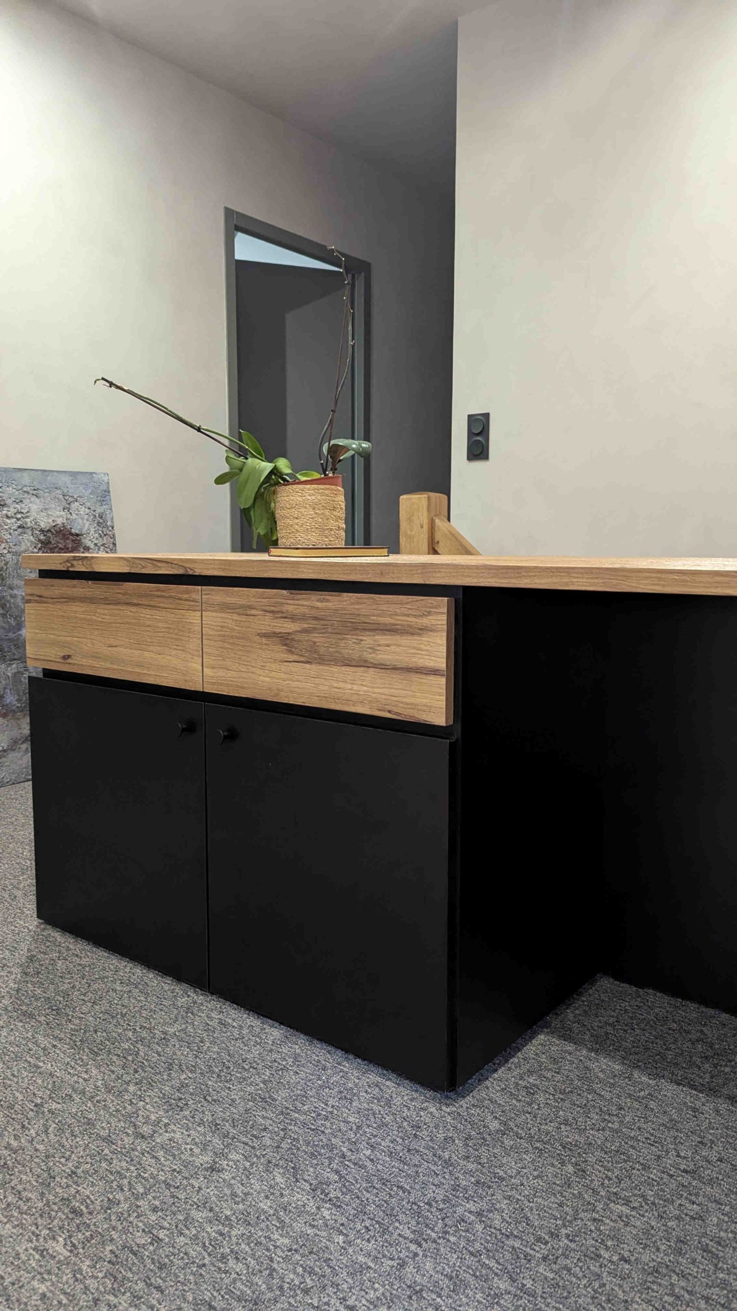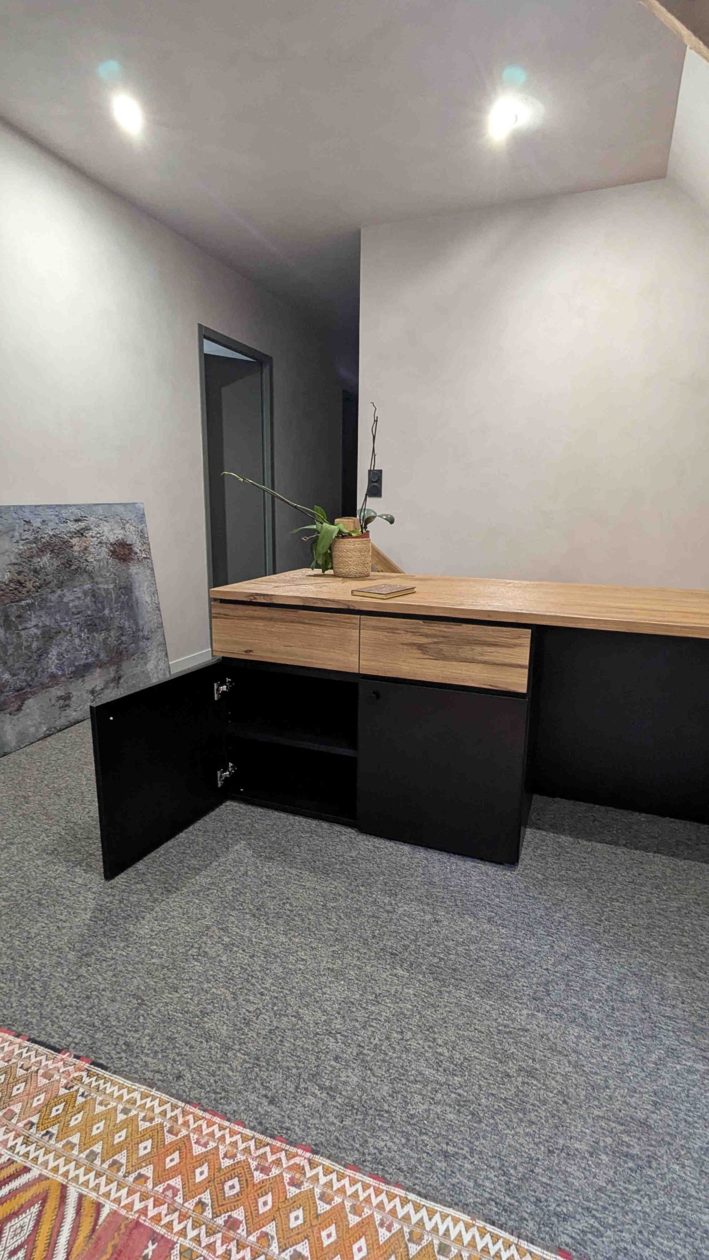 Un bureau sur-mesure conçu spécialement pour se greffer à son environnement. En effet, nous pouvons imaginer comme une continuité des éléments de charpentes et du rampant de toiture. Aussi, nous l’avons réalisé entièrement en réemployant un ancien aménagement de bar, de Rodez. En effet, le plateau ainsi que la structure noire sont issus d’anciennes cloisons de séparation de ce bar. Nous retrouvons ces éléments noirs plutôt en partie inférieure, à l’avant et à l’arrière du bureau. Le plateau quant à lui, en bois exotique, nous l’avons brossé et protégé à l’aide d’une huile portant la mention Écolabel Européen.
